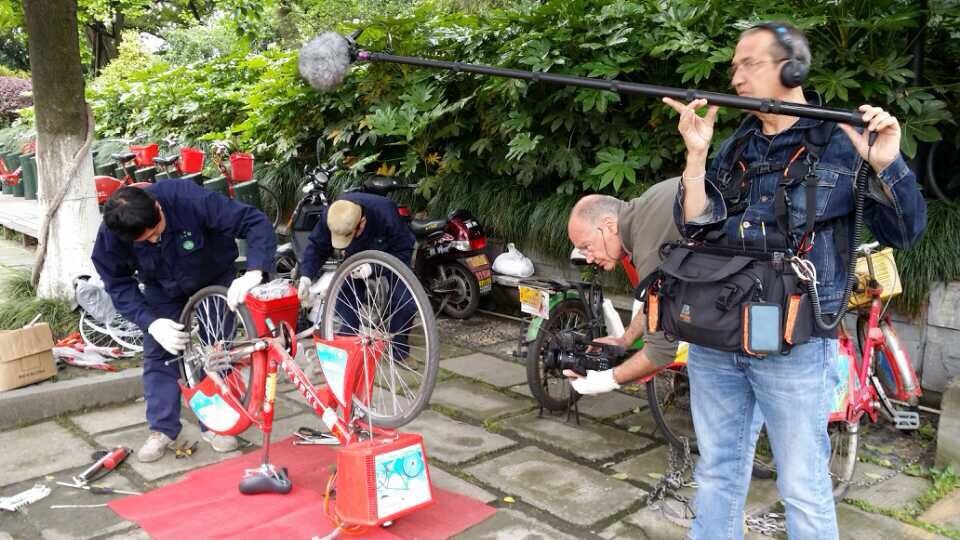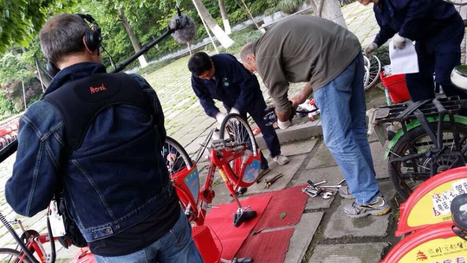 图为主持人奥利维尔·葛翰正在采访我司服务点的工作人员并拍摄其检修公共自行车的过程: