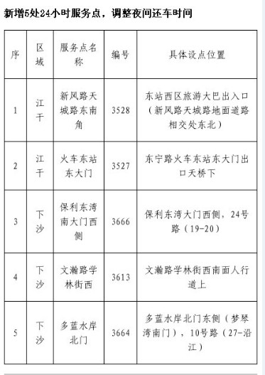 为进一步方便市民租车、服务广大群众,自5月5日起,公共自行车公司将新增主城区24小时服务点5处。同时主城区公共自行车的服务时间,由原来的6:00—21:00(夜间还车时间顺延一小时)调整为6:00—21:00(夜间还车时间顺延两小时)。