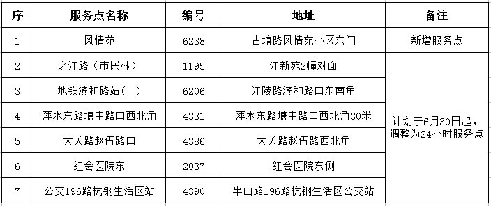 为进一步满足市民、游客的出行需求,且为广大租车群众提供优质服务。公共自行车公司日前新增1处服务点,现已投入运营。同时,计划于本月30日起,新增24小时服务点6处。具体点位情况详见下图所示。