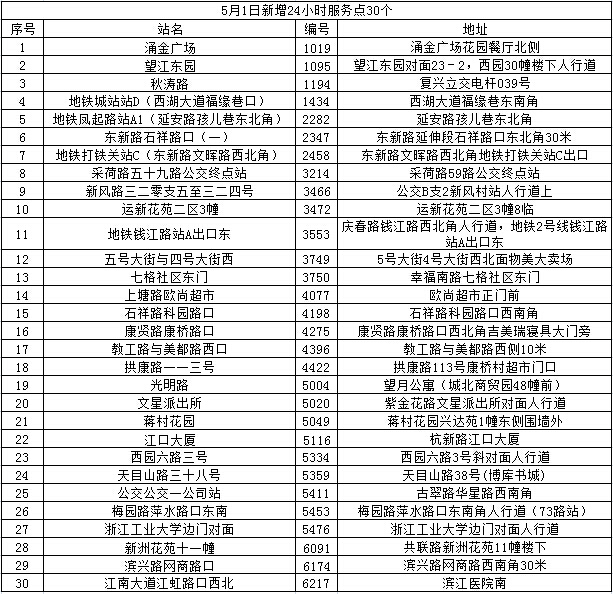 5月1日公司新增涌金广场等30个24小时公共自行车服务点