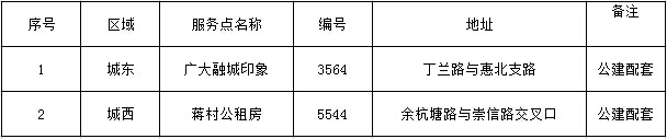 为进一步方便广大市民出行,优化服务点网络,杭州公共自行车公司将于今天起,新增广大融城印象、蒋村公租房两处公建配套公共自行车服务点投入营运,欢迎广大市民前往租还车。具体点位如下: