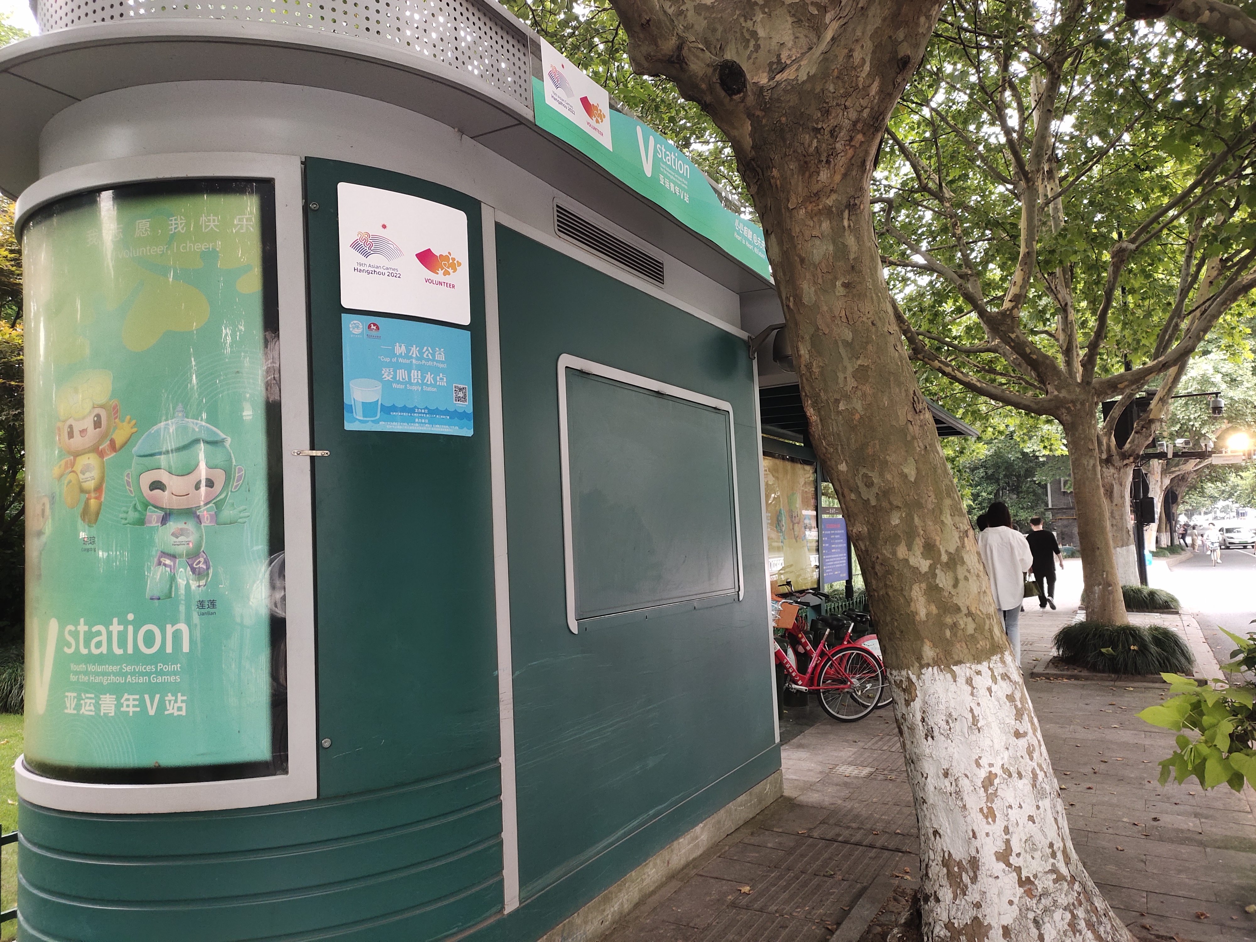 同样是在2023年的6月份,小红车开始将位于西湖景区周边的1253西湖时代广场一、5040凤起路环西路口、8004柳浪闻莺、1153延安路邮电路东北四个服务亭,改造成全新的亚运青年V站,后续将为公众提供引导、信息咨询等志愿服务。