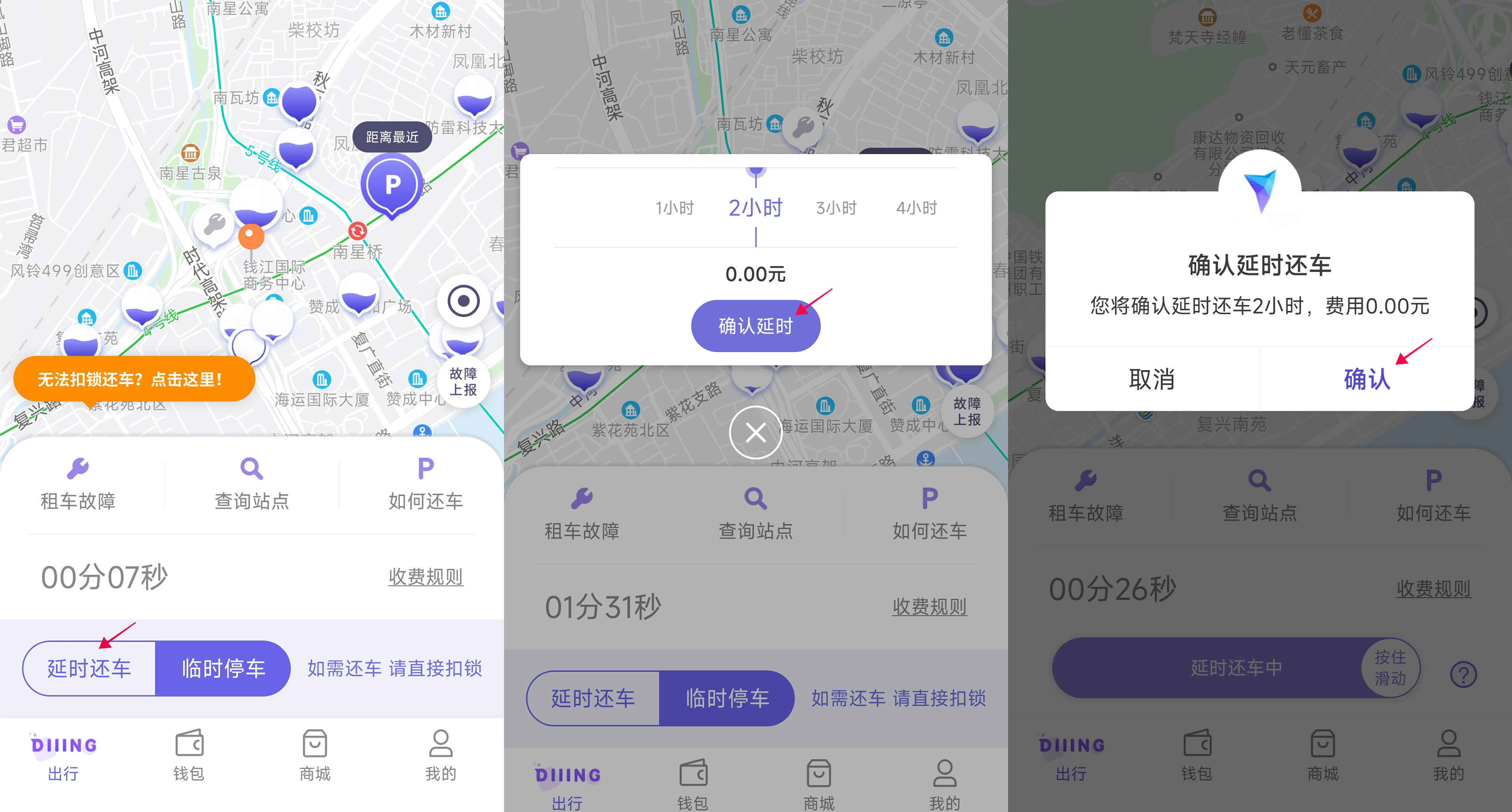 租用电子锁小红车后,只需打开叮嗒出行APP(支付宝、微信小程序)点击左下方的“延时还车”按钮,选择你想要延时的时间(两小时内都是免费的),点击“确认延时”,接着点击“确认”选项即可成功“延时还车”。这样我们就又多出两个小时的免费骑行时长啦!