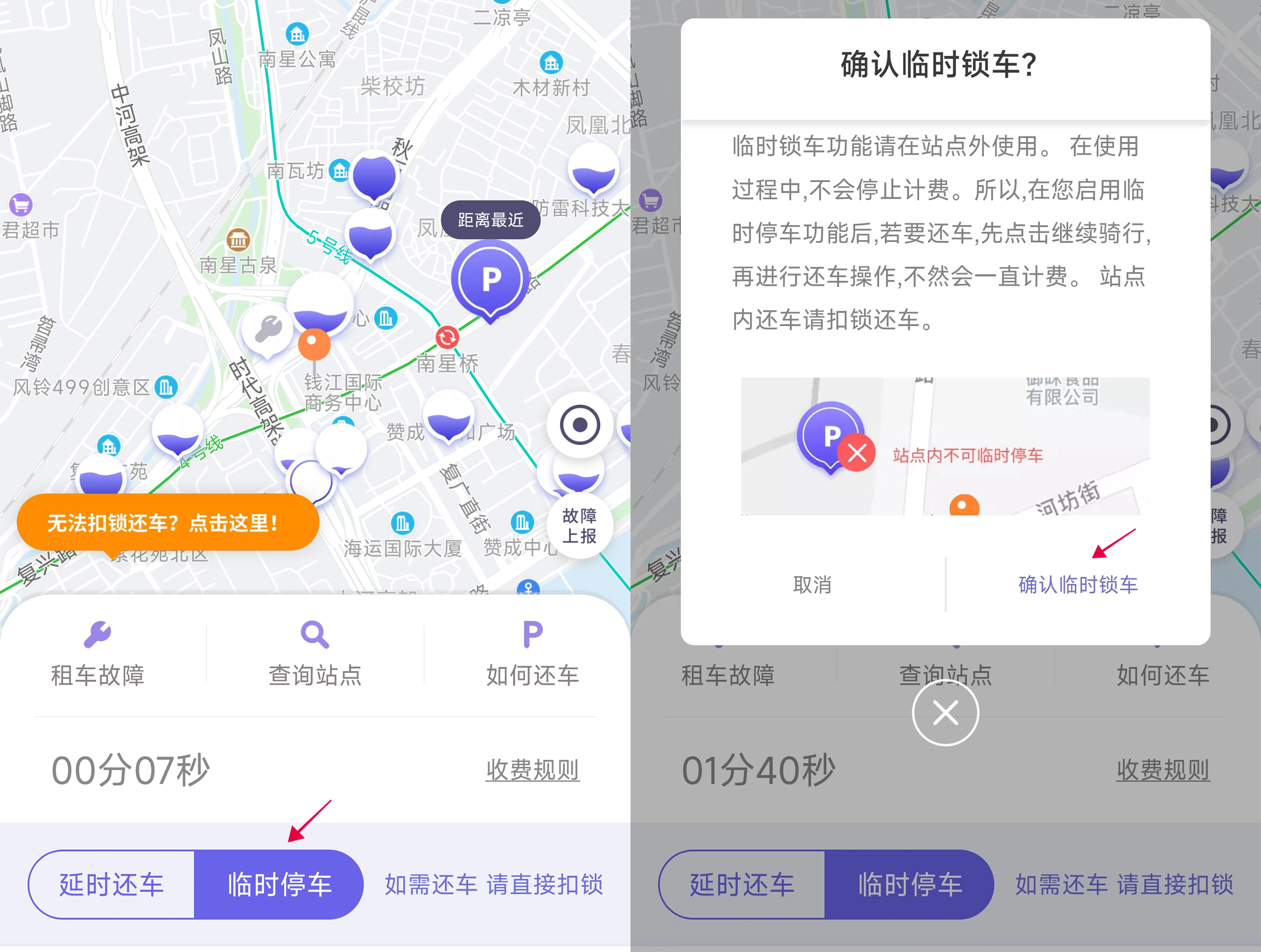 但在电子锁小红车上线之初,由于车辆数较少等原因,电子锁小红车的“延时还车”功能却并没有同步上线,暂时被电子锁小红车特有的“临时停车”功能所替代。很多市民游客也发现这个情况,并不时向小红车的后台反映。