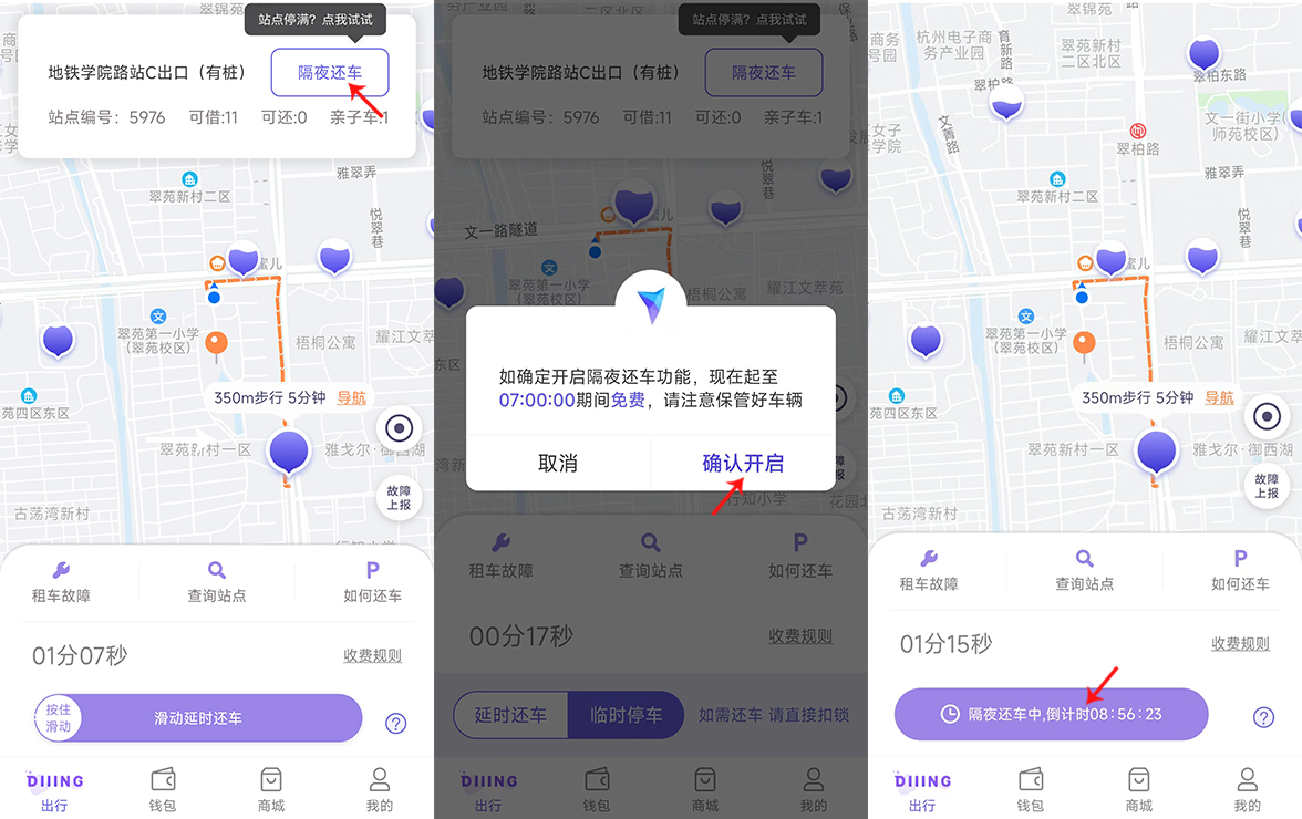 打开叮嗒出行APP(微信或支付宝小程序),点击小地图中附近的小气泡,接着点击右上角的“隔夜还车”选项(如果选项为灰色,表明超出了操作距离,可以到离服务点更近的位置),在弹出弹窗提醒后继续选择“确认开启”即可进入“隔夜还车”状态。