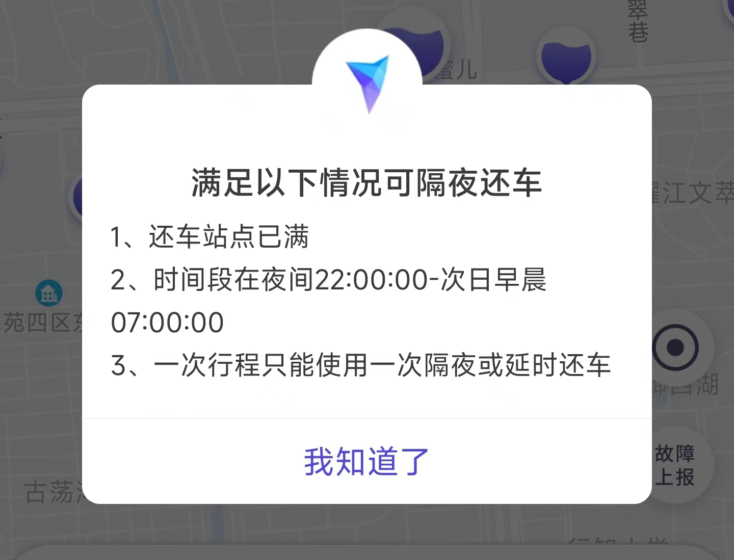 值得注意的是,使用扫码版“隔夜还车”功能时,必须要满足以下三个条件:服务点已经满架;时间段必须为夜间22:00—次日早晨7:00;单次行程内未使用“延时还车”功能。