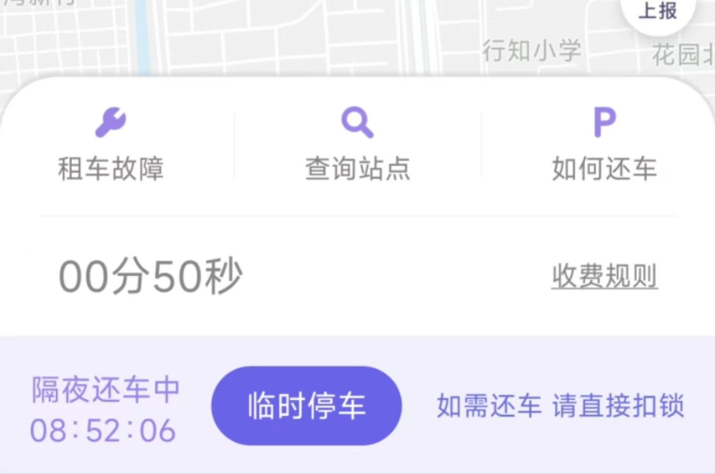 开启“隔夜还车”功能后,自开启时间起至7:00,费用为0元,第二天早上7:00前还车无需支付费用,7:00后还车则进入正常计费(每小时1元,单日单次封顶5元)